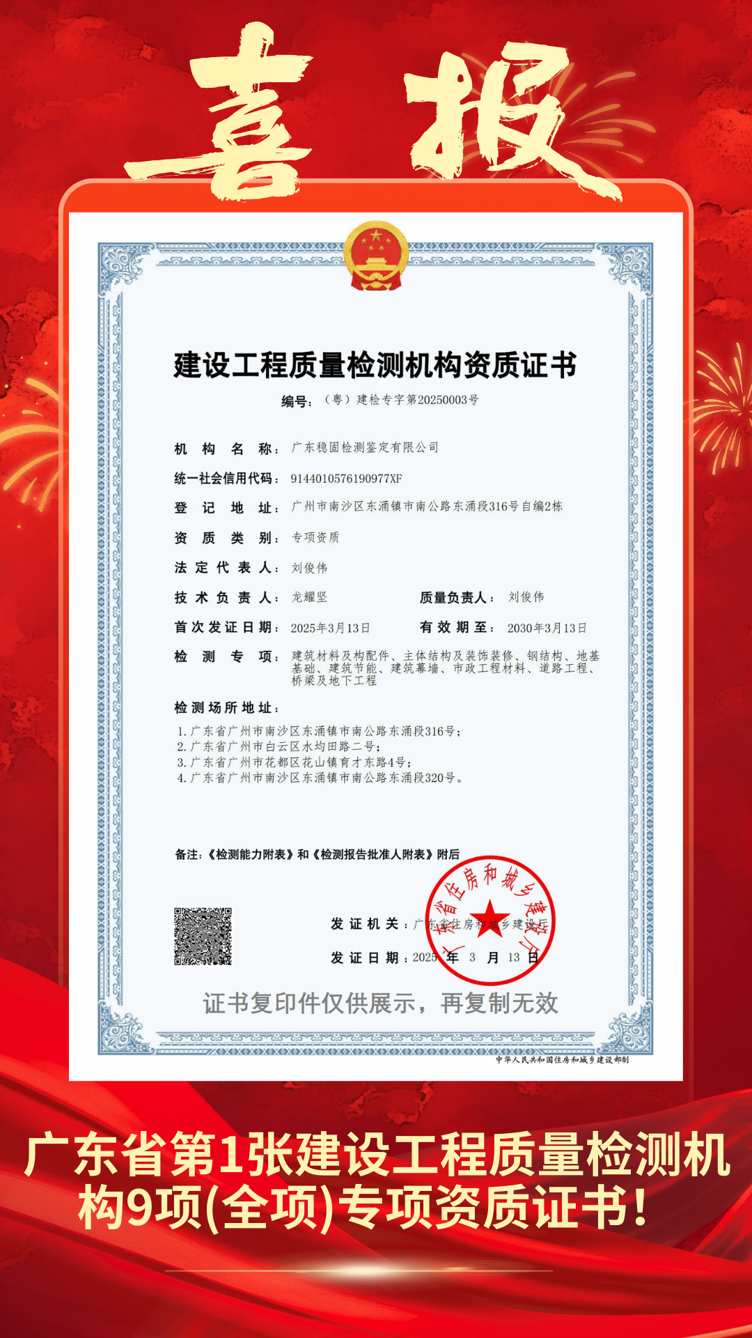 【喜報】全省第1張!廣東穩(wěn)固獲得建設工程質(zhì)量檢測機構(gòu)9項(全項)專項資質(zhì)證書!